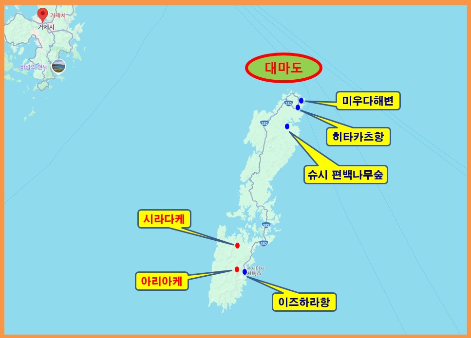 ▼대마도 내의 아리아케와 시라다케 위치와 1박2일 일정...