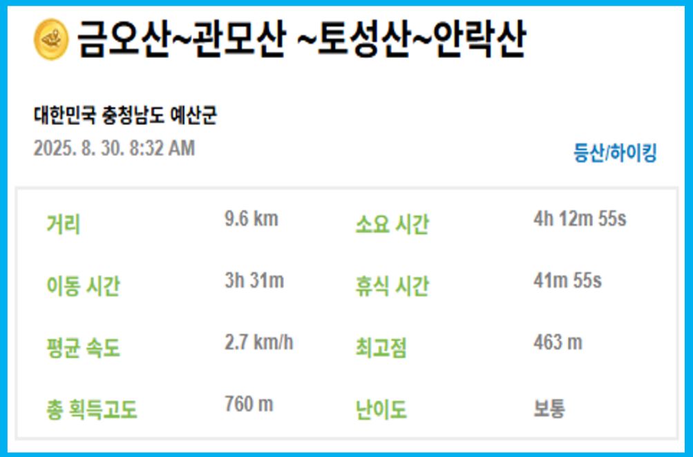 산행코스 : 예산군 문예회관(08:32)-금오산(08:55)-관모산(09:30)-토성산(10:07)-안락산(10:42, 30분간 식사)-예산향교(12:26)-문예회관(12:43)