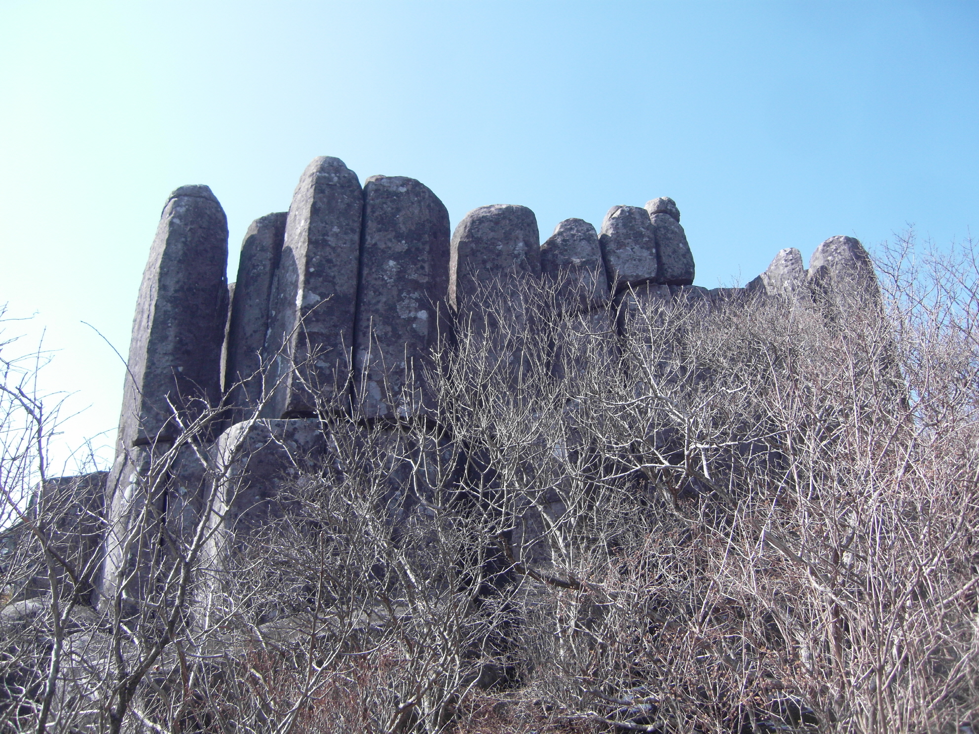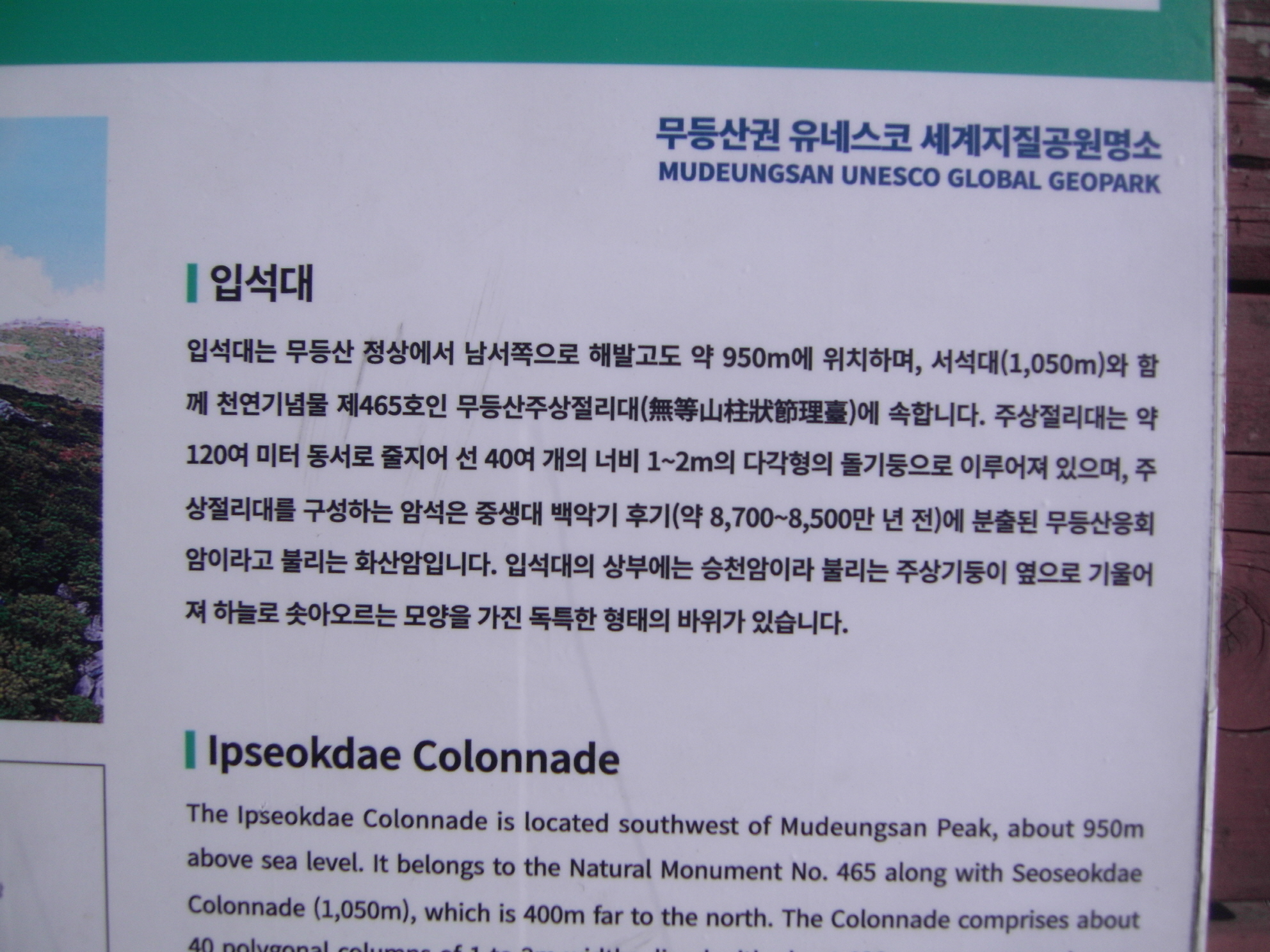 표석 너머로 서석대(왼쪽)와 입석대(오른쪽)이 보인다.